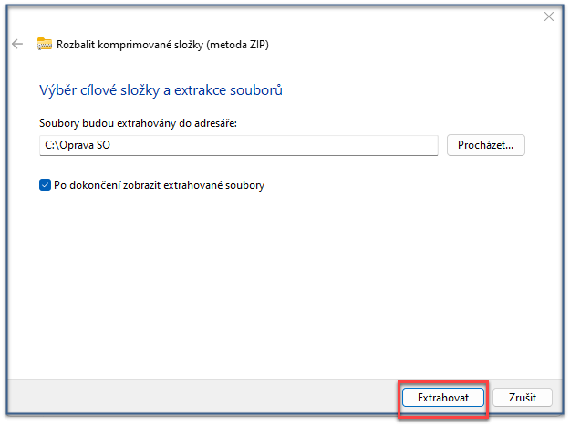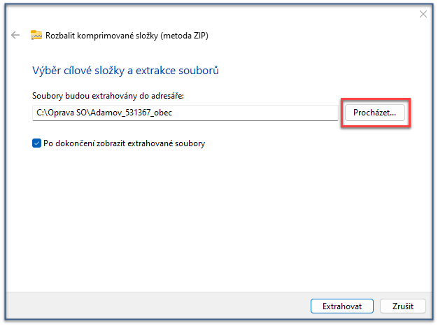 •Vyberte cílovou složku, do které budou soubory extrahovány (např. nově založená složka)