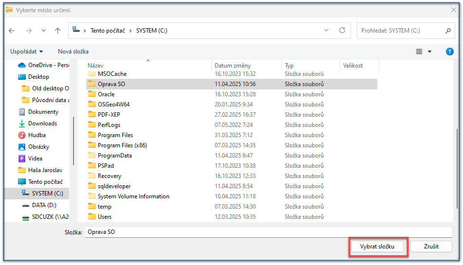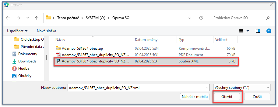 •Tlačítkem Zvolit soubor se spustí vyhledání souboru pro import (vyberete složku, do které jste extrahovali soubory), dvojklikem složku otevřete a k importu označíte Soubor XML; kliknete na tlačítko Otevřít.