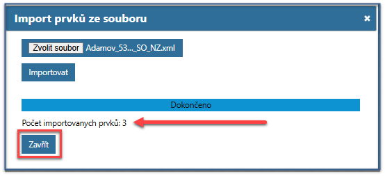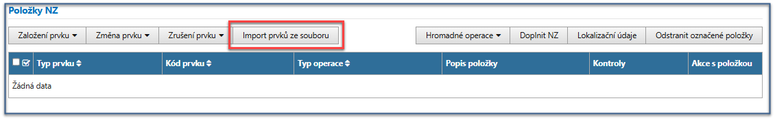 •Tlačítkem Importovat se spustí zápis definice prvků do NZ a definované kontroly formátu, struktury, existence/neexistence prvků v importovaném souboru. Pokud je vše v pořádku,