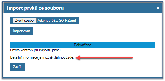 Do NZ se importují pouze prvky, které nejsou chybné. V případě chyby struktury nebo formátu souboru, nejsou do NZ importovány žádné prvky.
