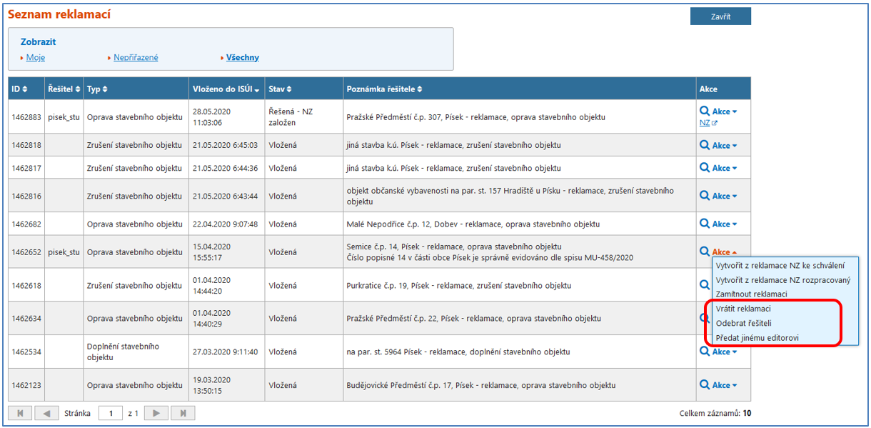 Předat jinému editorovi – jestliže reklamace nepřísluší vašemu OVM nebo agendě, můžete ji předat oprávněnému editorovi (OVM) s příslušnou působností (zejména speciálnímu stavebnímu úřadu nebo ve členěných statutárních městech u reklamací na Doplnění SO pod agendou obce na příslušný stavební úřad MOMC). Předávat lze všechny reklamace (vyjma reklamací na ulice) mezi agendou Obec a Stavební úřad navzájem. Znamená to, že např. stavební úřad může předat reklamaci na SO, který nevyžaduje stavební povolení ani ohlášení, na obec, která je zákonným editorem takového SO. Předat jinému editorovi lze reklamaci přiřazenou (řešitel je vyplněn) i nepřiřazenou (řešitel není vyplněn).