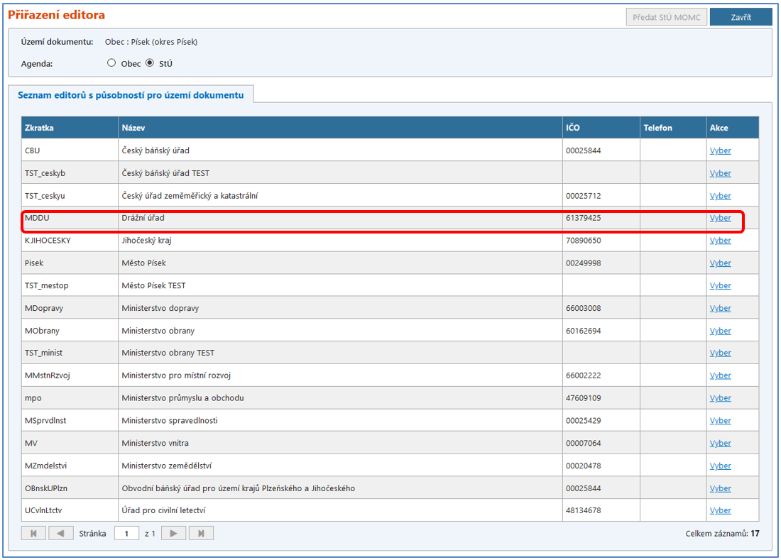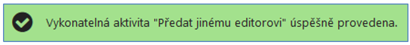 Vyberte editora (OVM) a v příslušném řádku klikněte ve sloupci Akce na Vyber. Objeví se potvrzovací okno, do kterého musíte povinně vyplnit důvod předání.