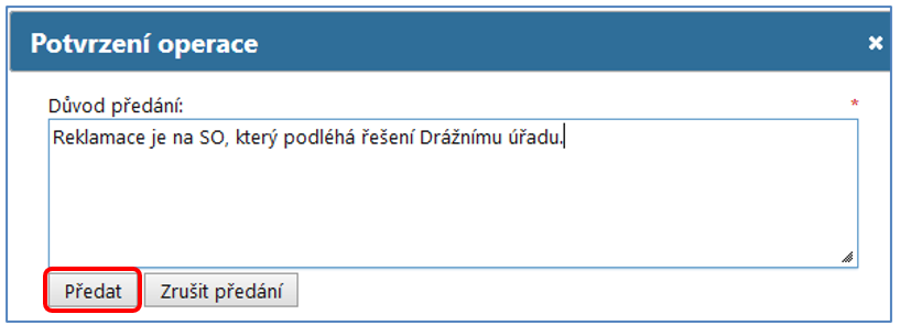 Vyplňte důvod předání a potvrďte předání reklamace tlačítkem Předat. Ve stavovém řádku se zobrazí potvrzující hláška a důvod předání se zapíše do poznámky řešitele. Reklamace po předání nevratně zmizí ze seznamu reklamací a pracovat s ní může již jen nový editor.