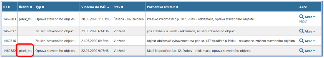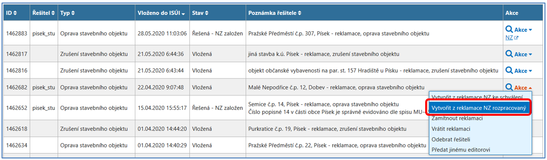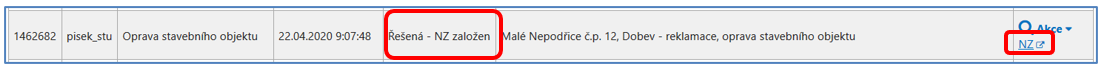 Jakmile vytvoříte Rozpracovaný NZ, reklamace změní svůj stav z Vložená na stav Řešená – NZ založen a v posledním sloupci Akce se objeví odkaz