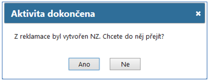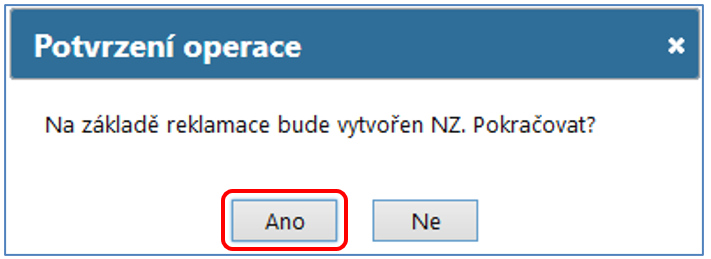 Následně se vytvoří Rozpracovaný NZ a v potvrzovacím okně máte možnost volbou Ano rovnou přejít do vytvořeného NZ a dále ho zpracovávat. Pokud chcete zůstat v reklamacích, zvolte Ne.