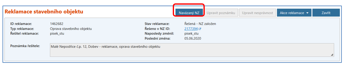 Pro zpracování NZ je tedy nutné být v NZ v editačním režimu. Buď jste do něj přešli rovnou po jeho vytvoření, nebo do něj můžete přejít až následně z detailu reklamace pomocí tlačítka Navázaný NZ. Odkaz s číslem NZ