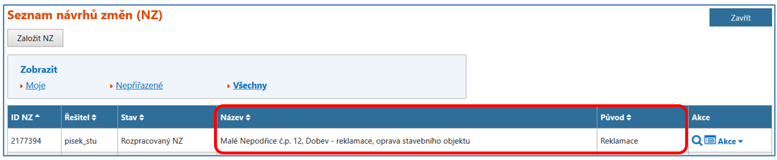 Do NZ můžete také přejít opuštěním reklamací a zobrazením Seznamu návrhů změn (NZ), kde máte NZ vygenerovaný. V názvu NZ je zobrazena informace o reklamovaném prvku a původ NZ je Reklamace.