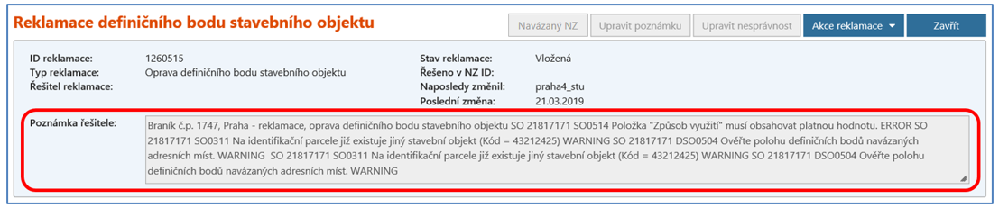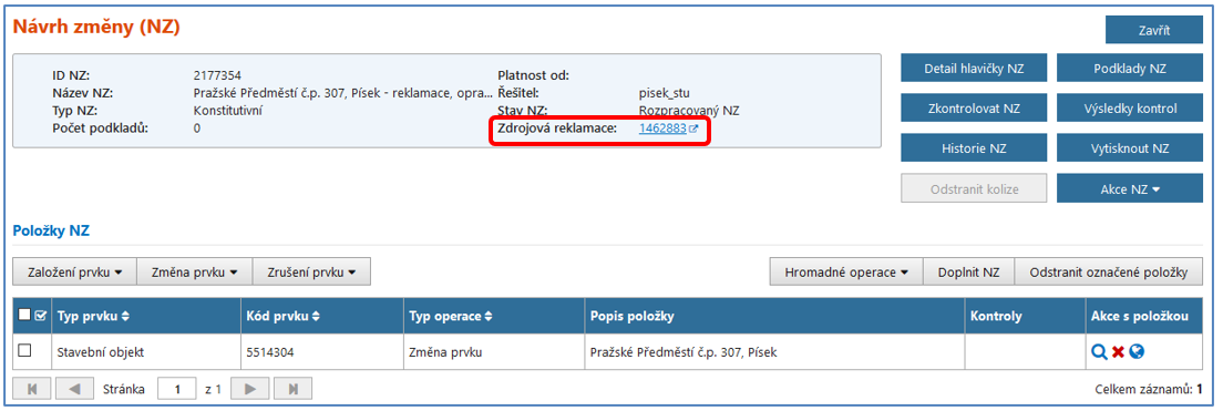 Pro vyřešení reklamace si musíte NZ z dotčené reklamace vytvořit. Chyby, případně varování se zobrazí i v detailu NZ vytvořeném z reklamace ve výsledcích kontrol. V Rozpracovaném NZ je vložen automaticky načtený SO – typ operace „Změna prvku“. Je nutné zkontrolovat všechny údaje uvedené v detailu SO a případně opravit popisné i lokalizační údaje podle aktuálního stavu. Pro úspěšné zpracování je nutné chybu odstranit a NZ dále zpracovat klasickým způsobem.