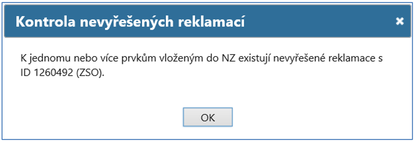 V případě načítání prvku do návrhu změny (NZ), který není vygenerován z reklamace a dotčený prvek je obsahem nevyřešené reklamace se uživateli zobrazí v okamžiku načtení prvku upozornění: