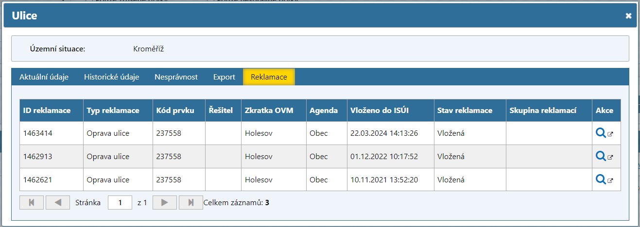 Reklamace na prvek ulice a adresní místo jsou přiřazeny k řešení agendě Obec a OVM dané obce.