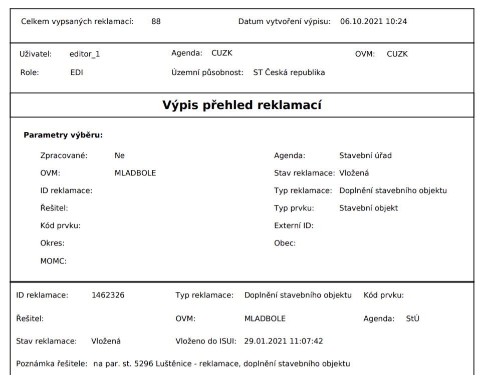V ostatních případech, tzn. data v ISÚI nejsou ve stavu, jaký požaduje reklamace, nebo shodná nevyřízená reklamace v systému dosud neexistuje, aplikace vrátí zadavateli reklamace zprávu o přijetí reklamace a reklamaci do systému uloží k vyřízení.