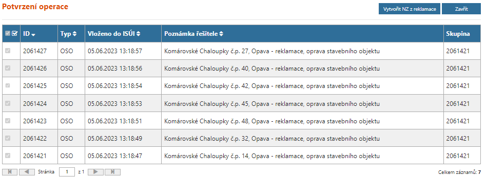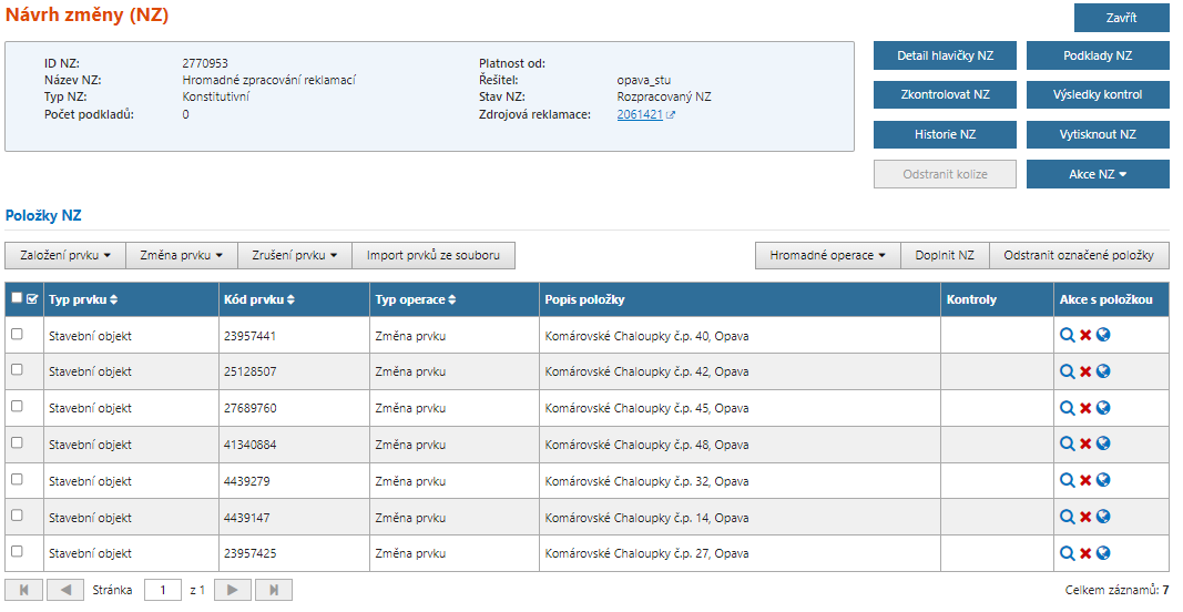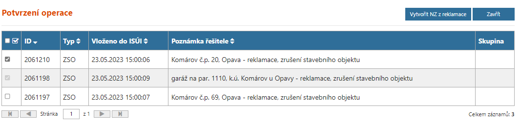 V případě automatického zamítnutí reklamace z důvodu zrušení reklamovaného prvku se automaticky zruší navázaný NZ.