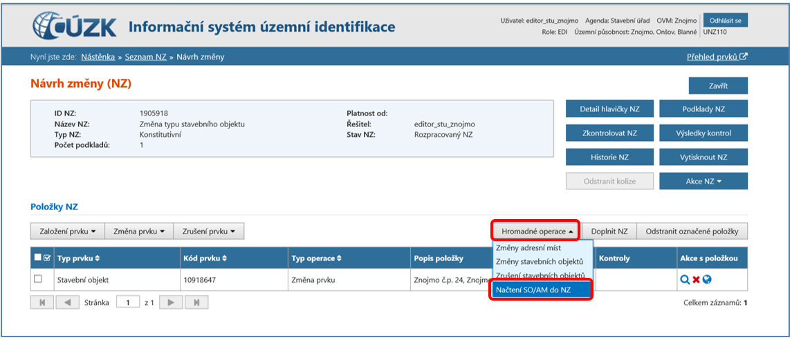 Nebo můžete použít funkci Hromadné operace v detailu NZ, kde zvolíte možnost Načtení SO/AM do NZ.