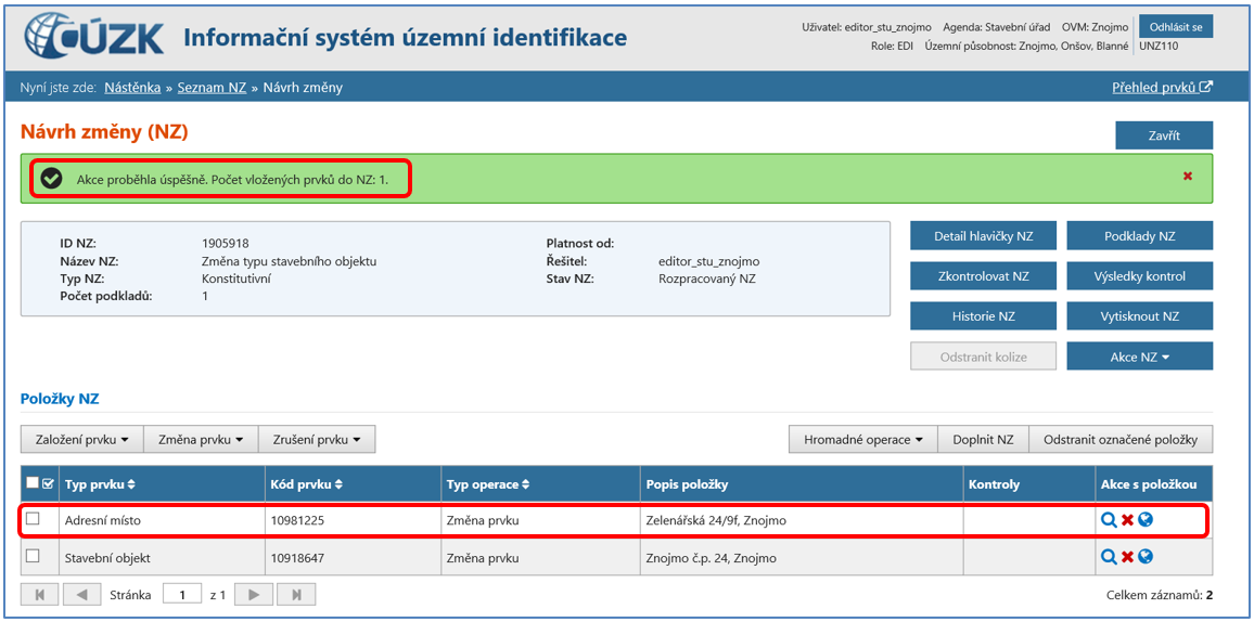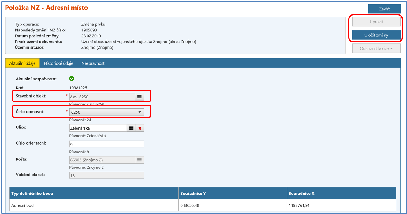 Do NZ se vám načte příslušné adresní místo do změny prvků.