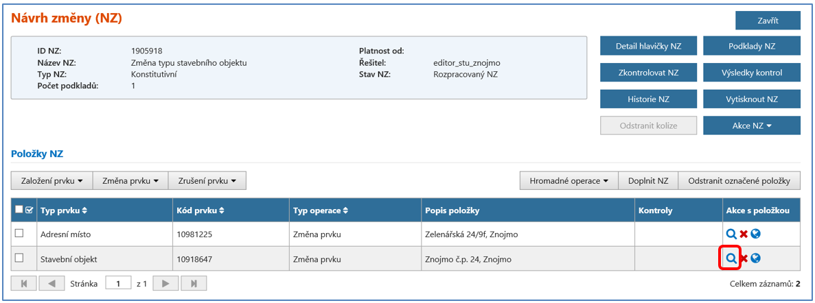 Nyní je potřeba upravit informace o stavebním objektu. Zobrazte si detail stavebního objektu kliknutím na ikonu lupa.