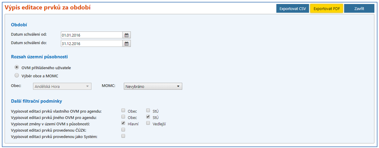 Vedlejší: ve výstupu budou zahrnuty prvky editované uživatelem, jehož agenda a OVM mají na zvoleném území vedlejší územní působnost (např. pokud máte uzavřenou VPS a editujete namísto sousední obce, máte na jejím území nastavenou vedlejší územní působnost).