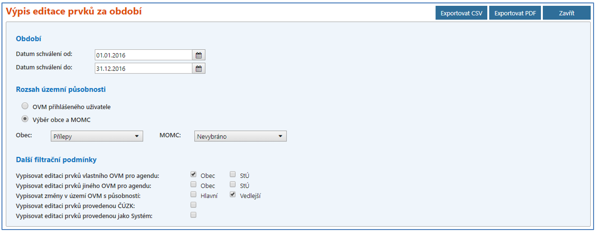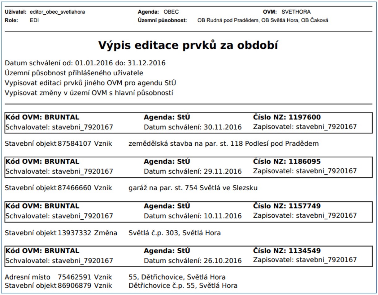 Obec: v sestavě budou vypsány prvky editované na zvoleném území jinou obcí – jiným OVM (např. při uzavření VPS máte možnost zjistit, co daná obec editovala na vašem území).