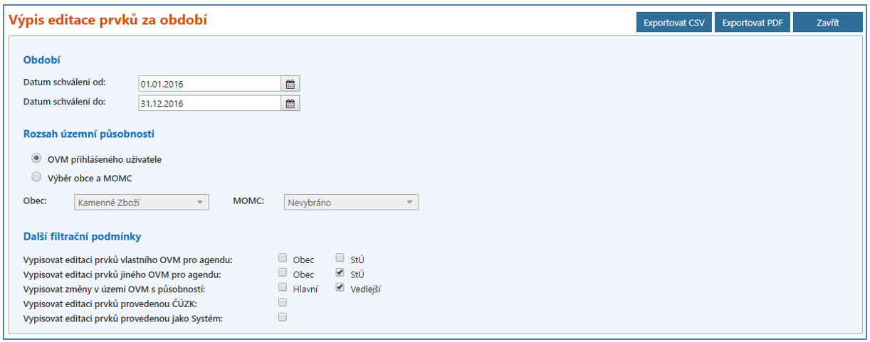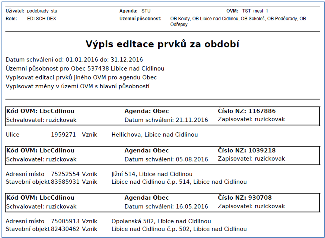 Příklad uvedeme pro stavební úřad Poděbrady, který bude požadovat seznam prvků editovaných obcí Libice nad Cidlinou v kalendářním roce 2016. Parametry sestavy je potřeba nastavit následně: