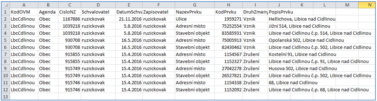 Obec: v sestavě budou vypsány prvky editované na zvoleném území pod agendou obce
