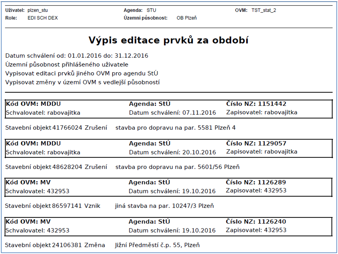 Uživatel je přihlášen do ISÚI pod agendou obecného StÚ a požaduje seznam prvků, které v celé jeho územní působnosti editovaly jiné stavební úřady (např. speciální StÚ, nebo jiný obecný StÚ v rámci EIA) v kalendářním roce 2016. Příklad je uveden pro StÚ Plzeň. Parametry sestavy je potřeba nastavit následně:
