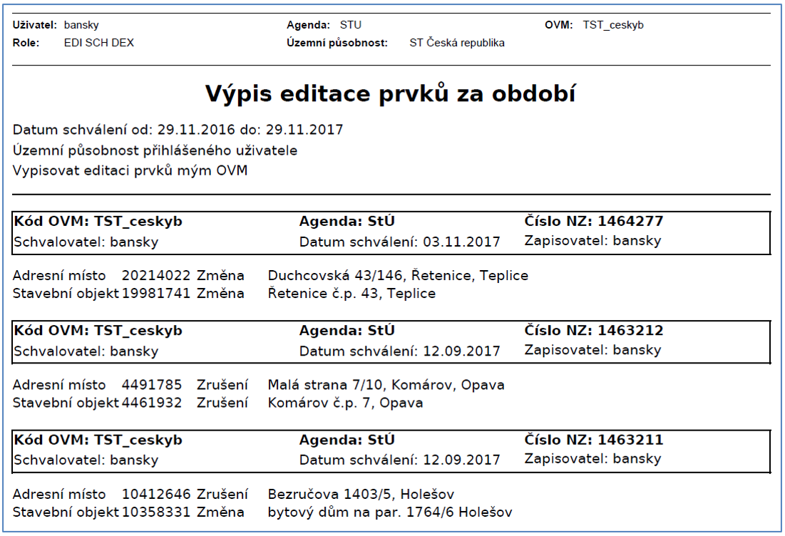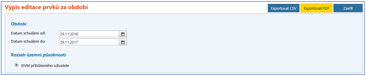 Ve výpisu je možné pouze měnit Období, ze kterého budou editované prvky vypsány. Po zvolení typu exportu dojde k výpisu sestavy se všemi prvky, které přihlášený speciální stavební úřad editoval ve zvoleném období.