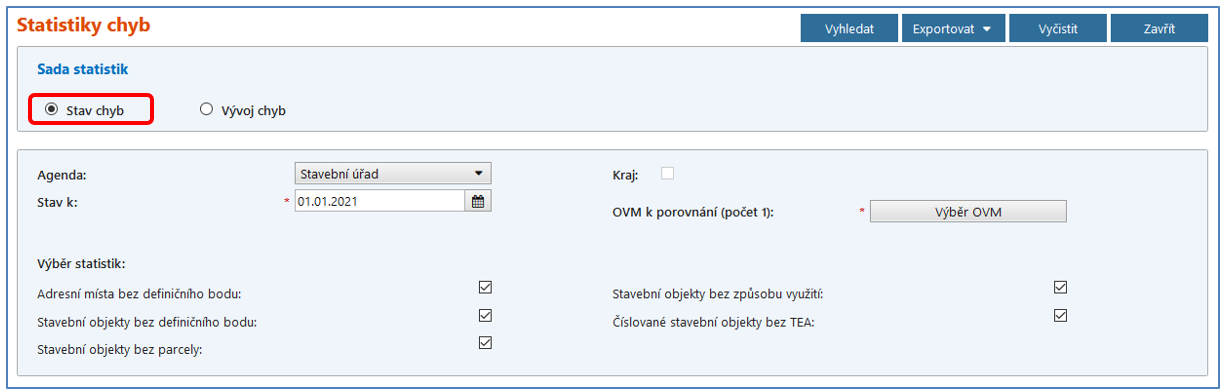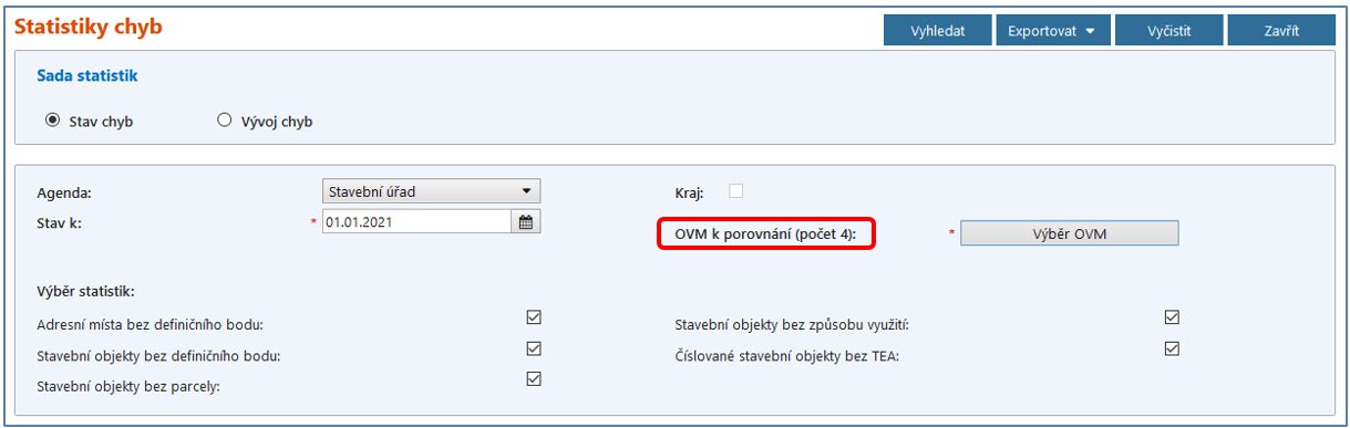 Agenda – na výběr jsou agendy Stavební úřad a Obec. Při přihlášení pod agendou Obec je ve výběru k dispozici pouze agenda Obec. Při volbě agendy Stavební úřad se ve statistikách vypisuje součet chyb ze všech obcí v územní působnosti zadaných stavebních úřadů. Podle zvolené agendy je omezený výběr OVM.