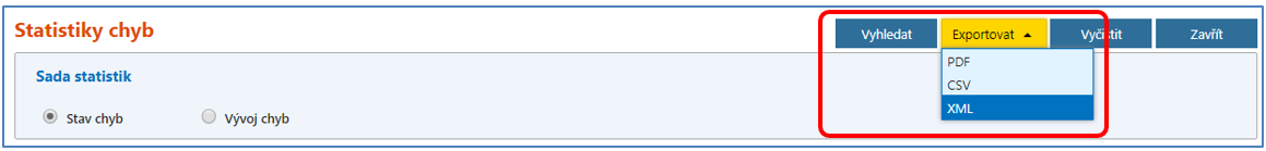 Po vyplnění všech požadovaných hodnot na formuláři je potřeba zvolit, zda chcete statistiky pouze zobrazit na obrazovce (tlačítko Vyhledat), nebo je vyexportovat do jednoho z nabízených formátů: PDF, CSV, XML (tlačítko Exportovat). Obsah exportovaných souborů je podrobněji uveden v kapitole Exporty statistik.