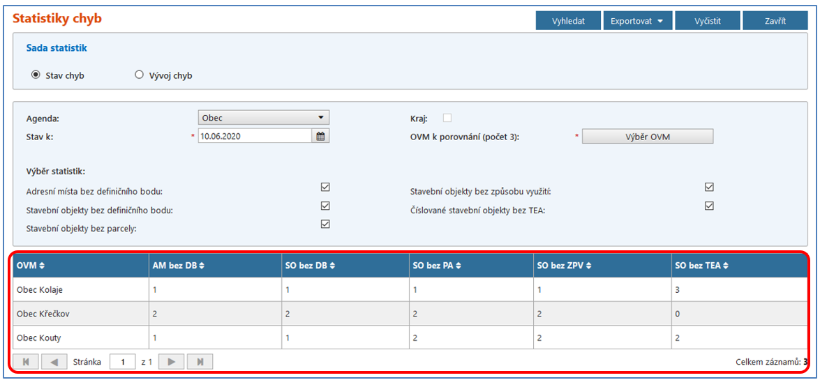 Při volbě Vyhledat se v dolní části obrazovky zobrazí počty chyb podle zadaných kritérií. Na jednotlivých řádcích jsou uvedeny všechny vybrané OVM a v jednotlivých sloupcích jsou u nich uvedeny počty konkrétních chyb k zadanému datu.
