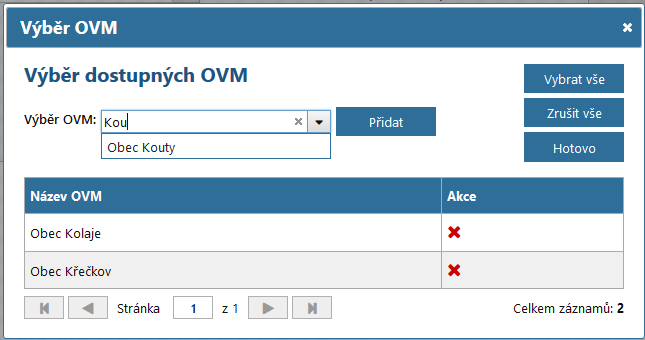 OVM lze vybrat buď z rozbalovacího seznamu nebo přes našeptávač při napsání alespoň dvou písmen z názvu OVM. Po zvolení požadovaného OVM ho přidáte do seznamu vybraných OVM tlačítkem Přidat. Všechny vybrané OVM jsou vypsány v tabulce v dolní části okna. Ze seznamu lze vybrané OVM odstranit červeným křížkem na konci řádku. Všechny vybrané OVM lze ze seznamu odstranit tlačítkem Zrušit vše.