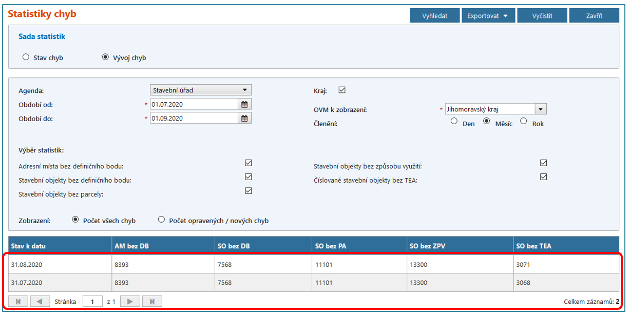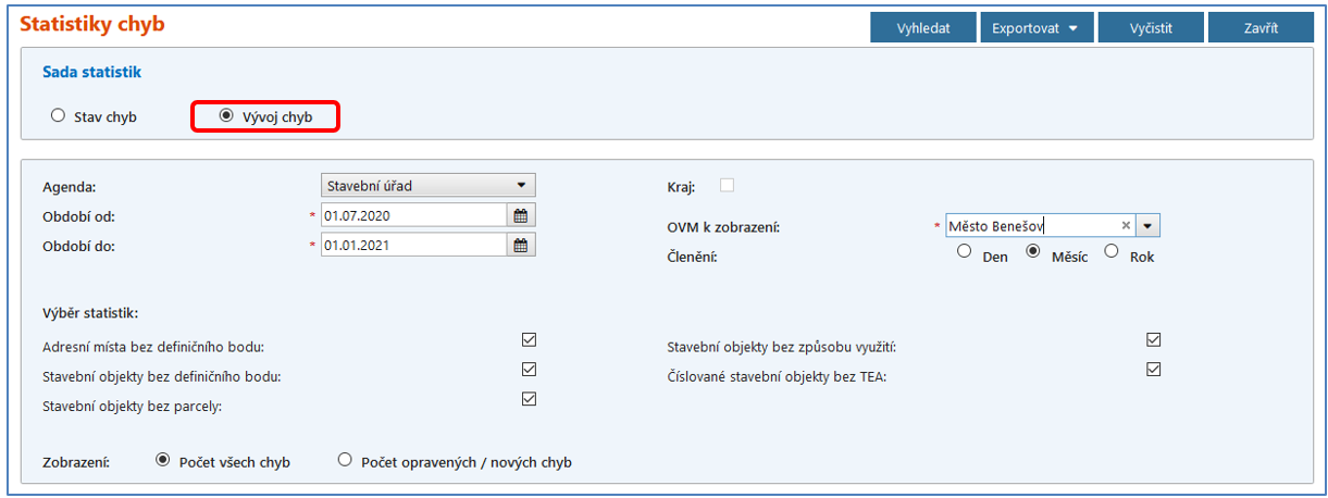 Počet všech chyb – ve výstupu budou uvedeny počty všech chyb zvoleného OVM a agendy v celém zadaném období pro časové úseky podle zvoleného členění. V případě členění po měsících nebo letech se vždy zobrazí údaj k poslednímu dni všech měsíců/let spadajících do zadaného období. Počet opravených / nových chyb – ve výstupu budou uvedeny počty opravených chyb v časových úsecích určených zadaným členění, tedy počet opravených chyb v jednotlivých dnech/měsících/letech z celého zadaného období. Výjimku tvoří statistika Nové číslované SO bez TEA, ve které není za dané období vypsán počet opravených chyb, ale počet nově vzniklých chyb.