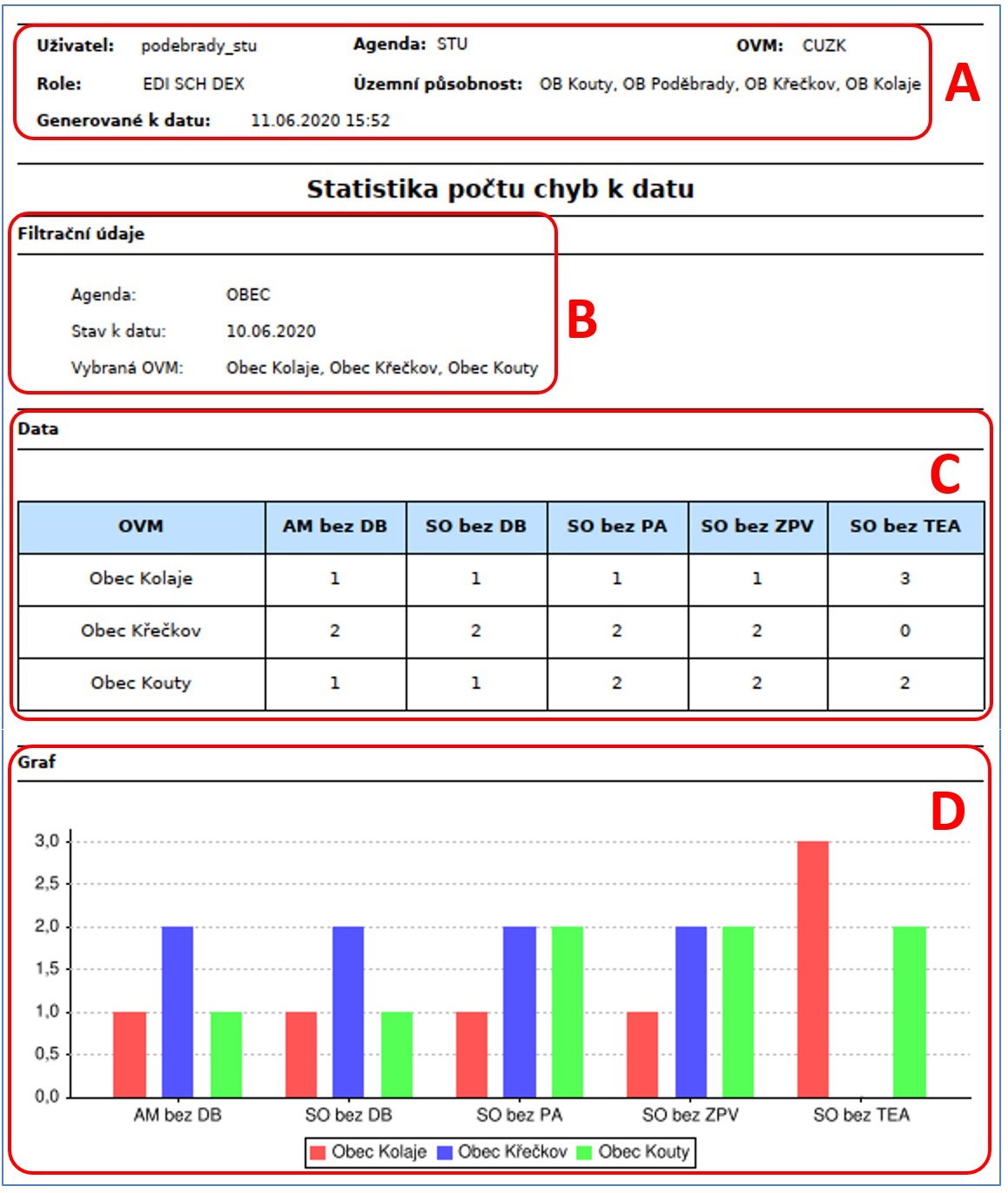 PDF soubor obsahuje vždy záhlaví, kde jsou informace o přihlášeném uživateli a čas generování exportu. Dále jsou v souboru uvedeny zadané filtrační údaje a bloky s výstupy: tabulka s počty chyb jednotlivých OVM a stejné údaje zobrazené v grafu.