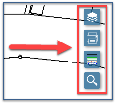 Grafické okno lokalizace prvků mapy obsahuje 4 panely nástrojů pro ovládaní zobrazení mapy a nastavení obsahu mapových podkladů