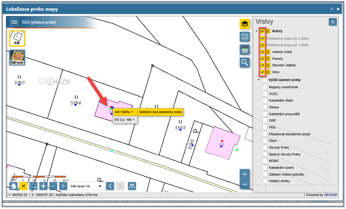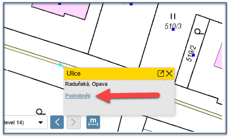 V případech, kdy jsou definiční body prvku např. definiční bod stavebního objektu a definiční bod adresního místa na stejné poloze, je zobrazen sdružený definiční bod - najetím na tento bod máte možnost vyběru konkrétního prvku a zobrazení podrobnějších informací o daném prvku