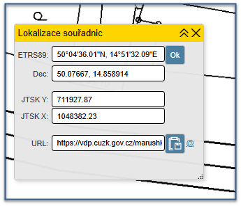 šířky a délky jsou ve Světovém geodetickém systému 1984 (WGS84), používá je například globální navigační družicový systém (GNSS). Souřadnice Y, X jsou v systému Jednotné trigonometrické sítě katastrální (S-JTSK). Z pole URL je možné zkopírovat odkaz, který otevře aktuálně zobrazenou mapovou kompozici.