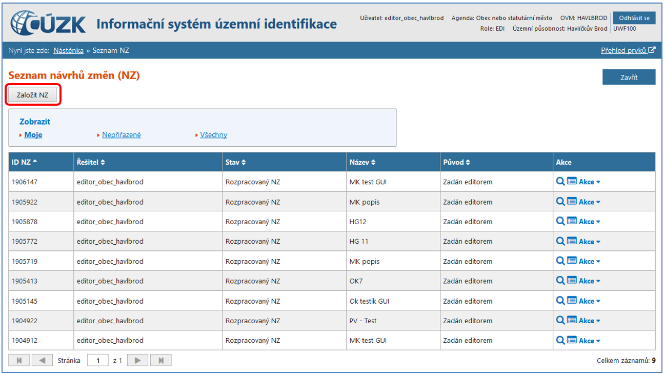 Z obrazovky Seznamu návrhů změn (NZ) je dále možné založit nový NZ, případně přecházet do detailů již existujících NZ a provádět s nimi další akce.