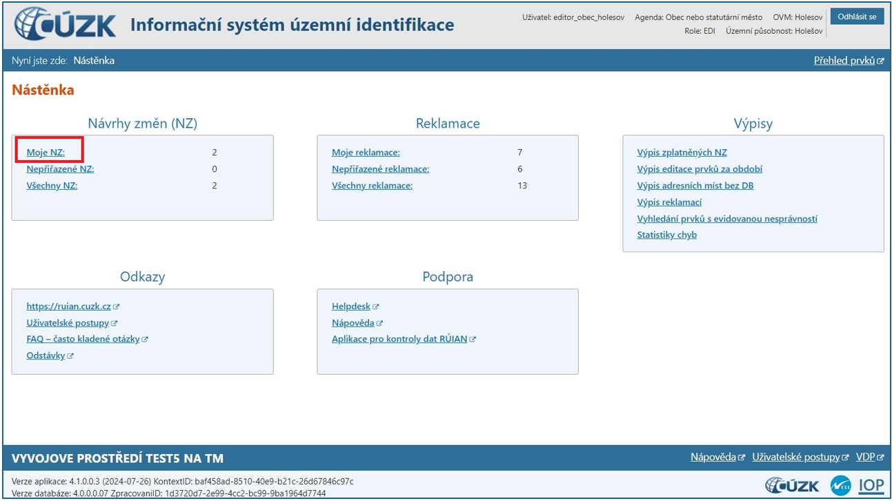 Po přihlášení do aplikace ISÚI prostřednictvím Jednotného identitního prostoru – JIP jako Zapisovatel se Vám zobrazí tzv. Nástěnka (úvodní strana aplikace). Jedná se o základní obrazovku aplikace, která obsahuje souhrnné informace o dokumentech v systému ISÚI. Nástěnka je rozčleněna na pět bloků (Návrhy změn (NZ), Reklamace, Výpisy, Odkazy a Podpora).