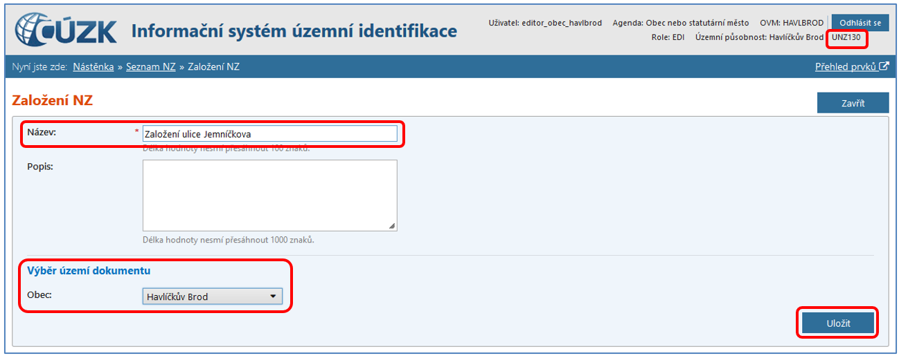 Dostanete se do formuláře pro založení nového NZ (obrazovka UNZ130 - označení obrazovky je vždy uvedeno v pravém horním rohu), který má konstitutivní charakter zápisu do RÚIAN. Konstitutivní změny platí okamžikem zápisu do RÚIAN.