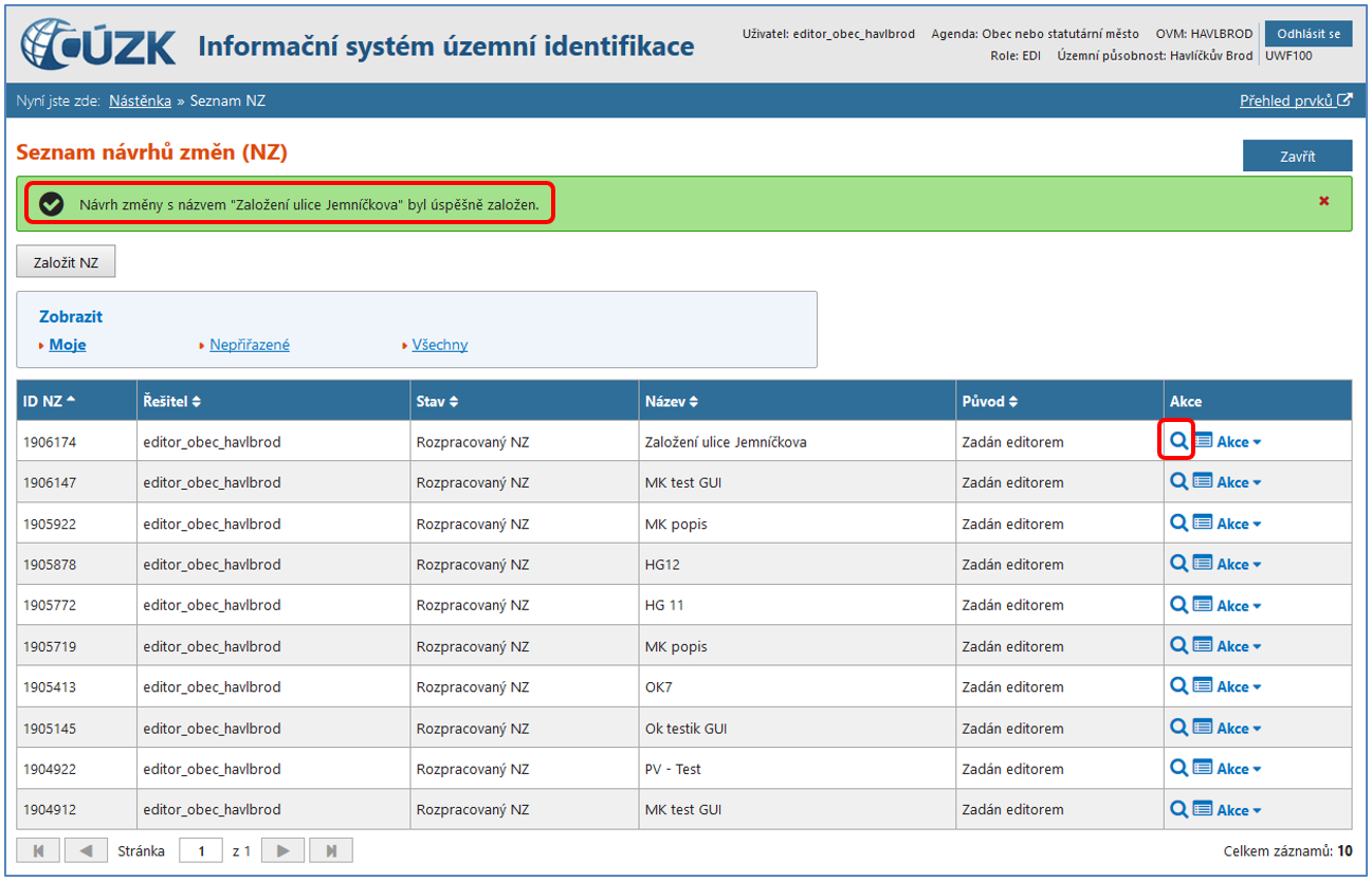 Nový návrh změny se objeví v Seznamu návrhů změn (NZ), obrazovka UWF100, aplikace v horní části obrazovky zobrazí hlášku, že NZ byl úspěšně založen.