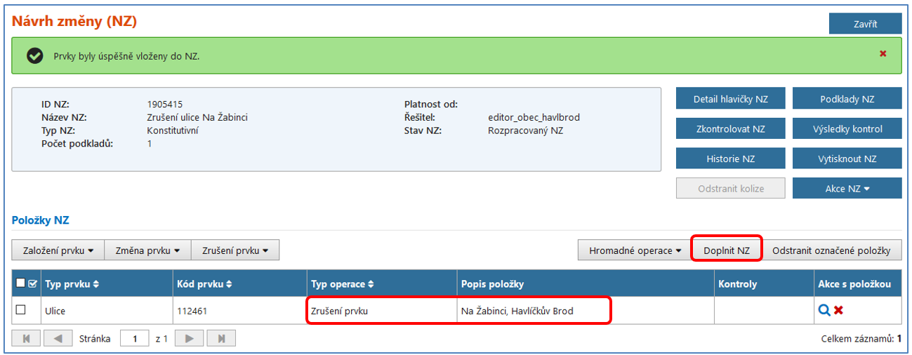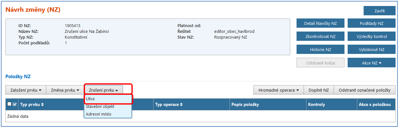 Pro zrušení prvku ulice je potřeba si založit nový NZ dle výše zmíněného postupu, nebo zrušení provést v již založeném NZ, který obsahuje i jiné položky. Do návrhu změny přidejte potřebný/é podklad/y.