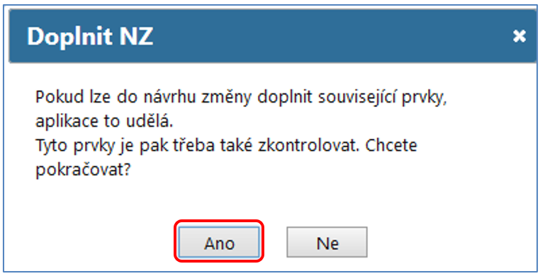 Pokud jsou na ulici navázána adresní místa, je potřeba je také upravit. Pro načtení všech adresních míst navázaných na rušenou ulici je možné použít funkci Doplnit NZ (tlačítko v bloku položek NZ). V potvrzovací hlášce klikněte na Ano.