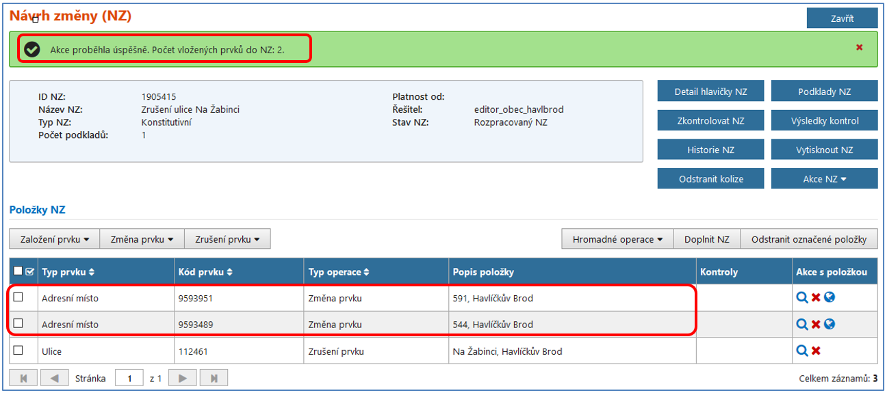 Při použití této funkce bude NZ doplněn o všechna AM s vazbou na rušenou ulici s typem operace Změna prvku. Navíc bude u každého načteného adresního místa původní ulice odmazána. Aplikace zahlásí úspěšné provedení akce s počtem vložených prvků do NZ.