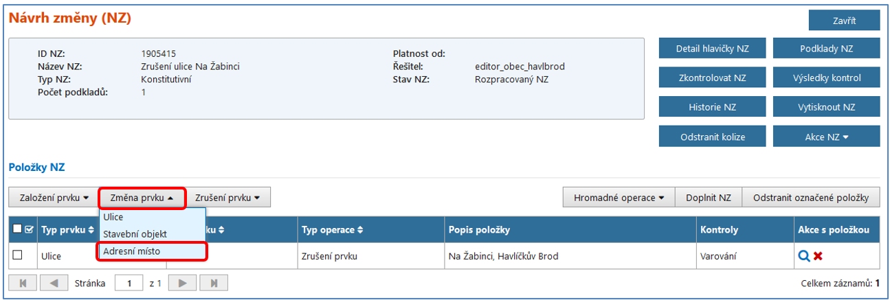 Alternativou funkce Doplnit NZ je možnost načíst do NZ jednotlivá adresní místa tak, že v detailu NZ (obrazovka UNZ110) klikněte na Změna prvku a v nabídce zvolíte Adresní místo.
