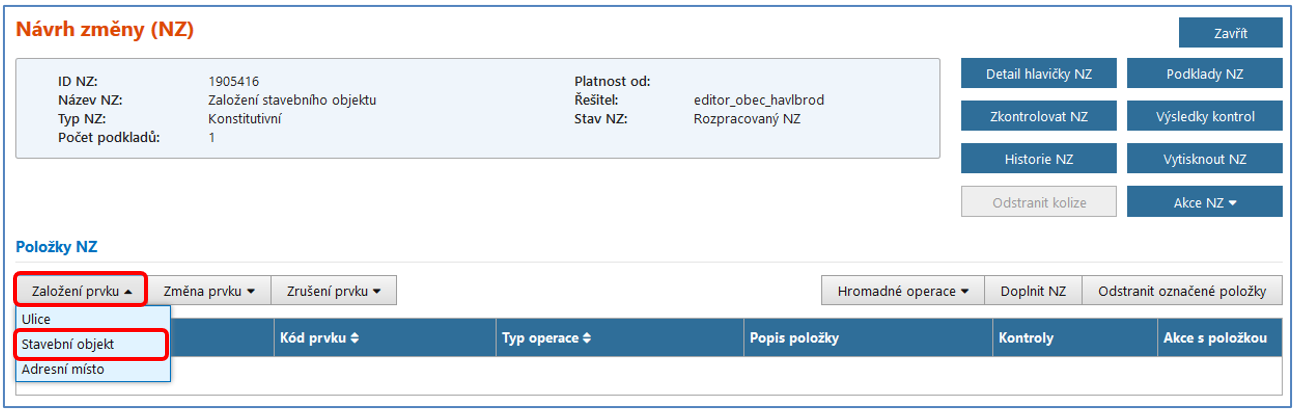Pro založení stavebního objektu je potřeba si založit nový NZ nebo změnu provést v již založeném NZ. Do návrhu změny přidejte potřebný/é podklad/y, následně klikněte na Založení prvku a v nabídce zvolte Stavební objekt.