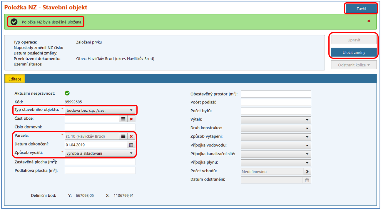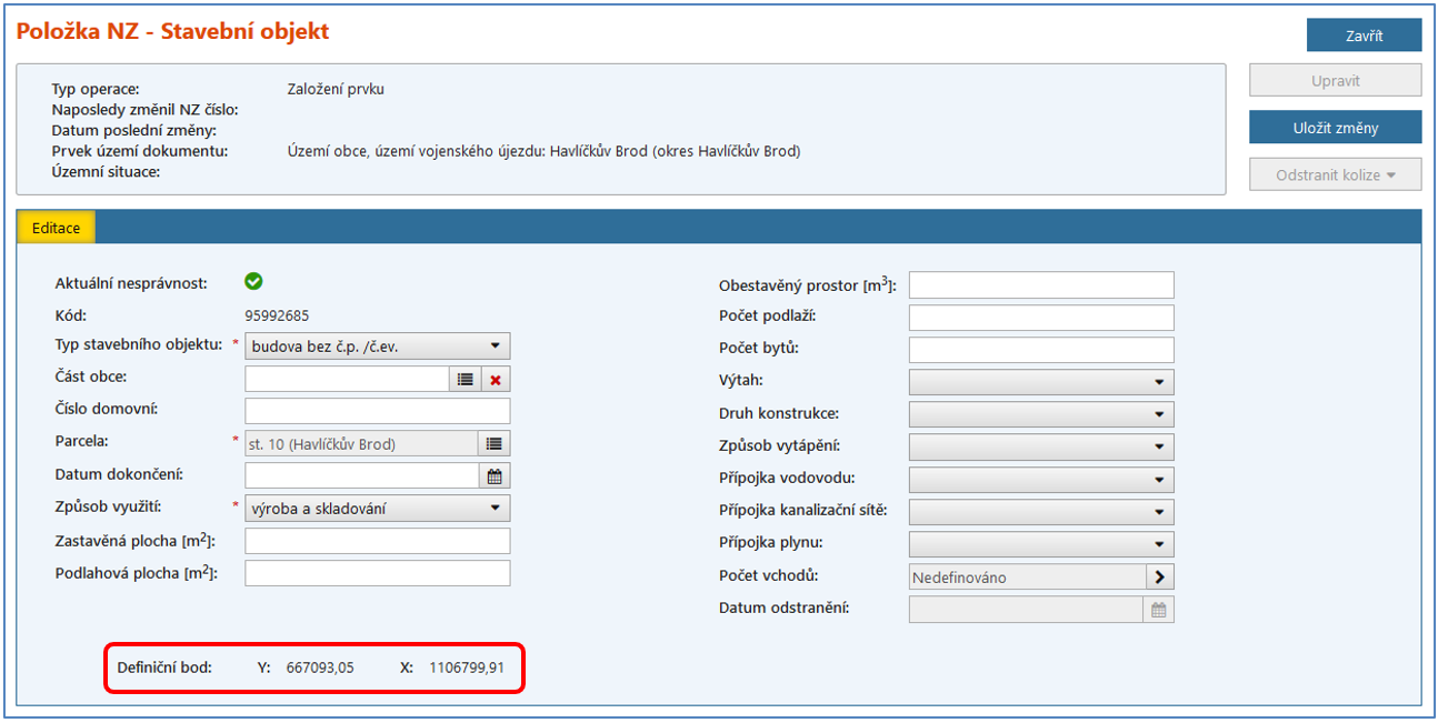 Nyní si můžete ověřit v detailu stavebního objektu, že Vámi zadaná poloha definičního bodu byla vložena – souřadnice Y, X jsou vyplněné.