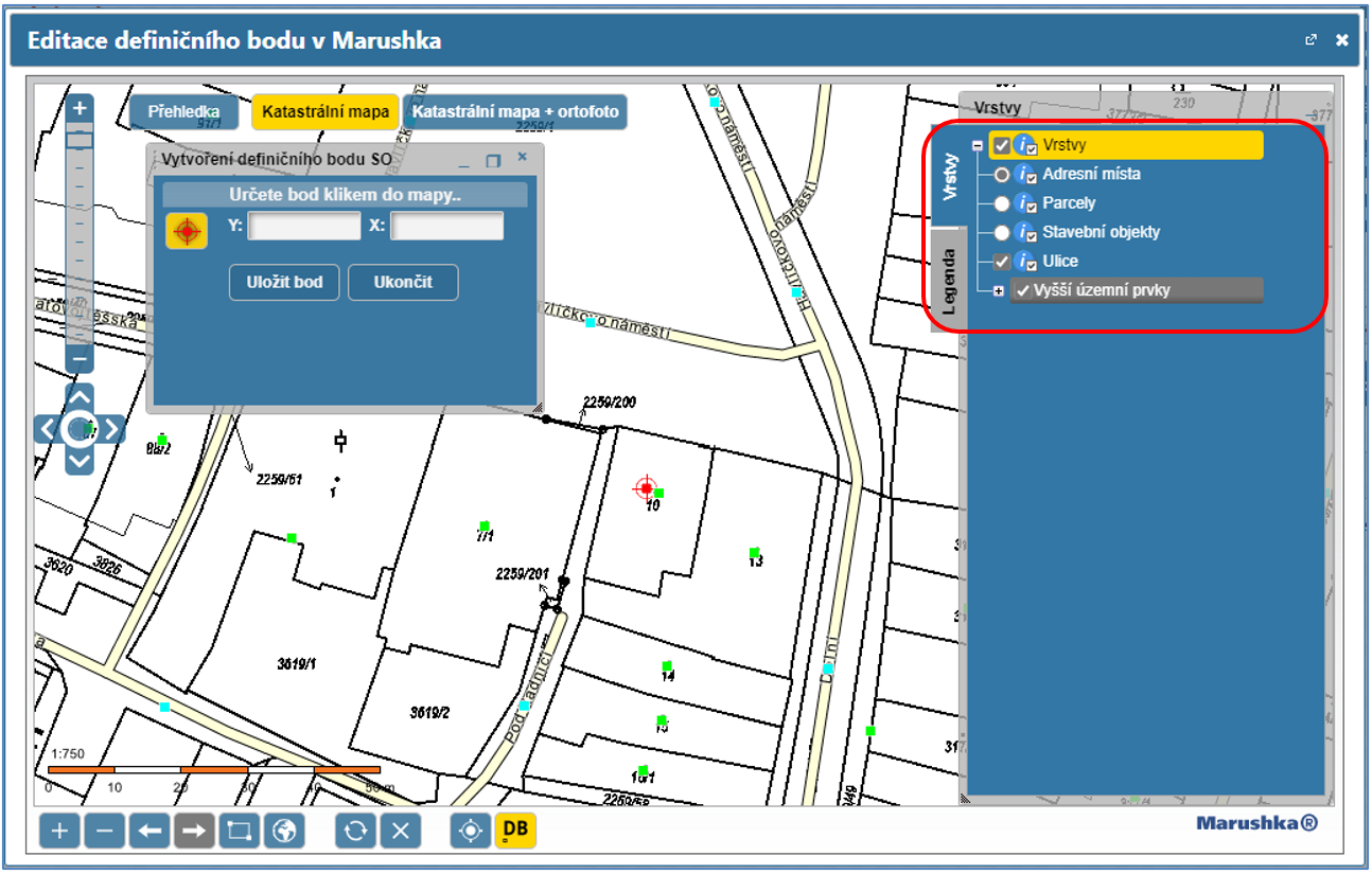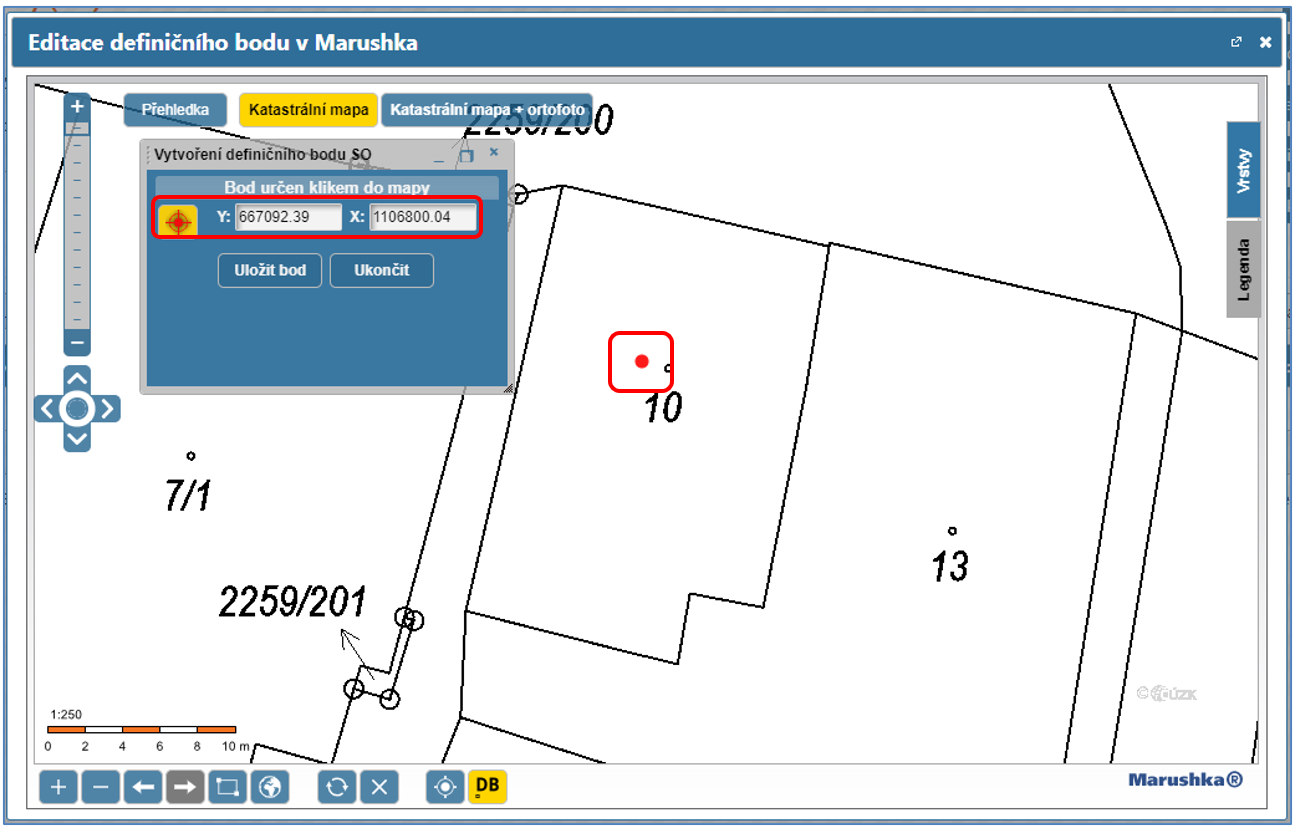 Opakovaným kliknutím na jiné místo můžete upravit jeho polohu. Definiční bod stavebního objektu se zadává do těžiště (doprostřed) identifikační parcely stavebního objektu. Zároveň se v polích Y a X v podřízeném okně zobrazí přesné souřadnice zadaného bodu. Polohu definičního bodu můžete také do těchto polí manuálně zapsat.