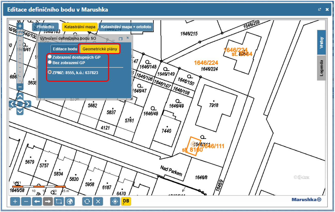 Zobrazení dostupných GP - zobrazí všechny dostupné geometrické plány v okolí.