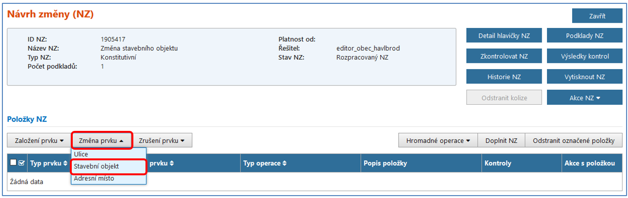 Pro změnu stavebního objektu je potřeba si založit nový NZ nebo změnu provést v již založeném NZ. Do návrhu změny přidejte potřebný/é podklad/y. Následně klikněte na Změna prvku a v nabídce zvolte Stavební objekt.