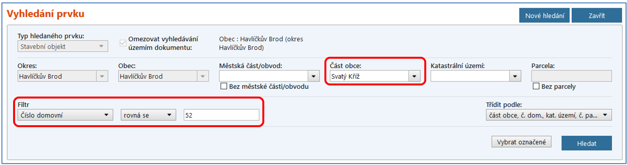 V případě, že hledáte číslovaný stavební objekt, vyplňte pouze Část obce a do Filtru číslo domovní. Např. Část obce: Svatý Kříž a Číslo domovní: 52.