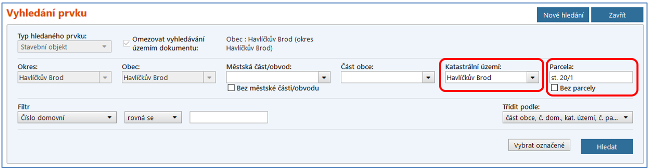 Pokud však hledáte nečíslovaný stavební objekt, pak naopak nesmíte vyplnit Část obce, kterou nečíslované SO neobsahují, ale zadejte do formuláře pouze Katastrální území a Parcelu, na které objekt stojí. Např. Katastrální území: Havlíčkův Brod a Parcela: 20/1.