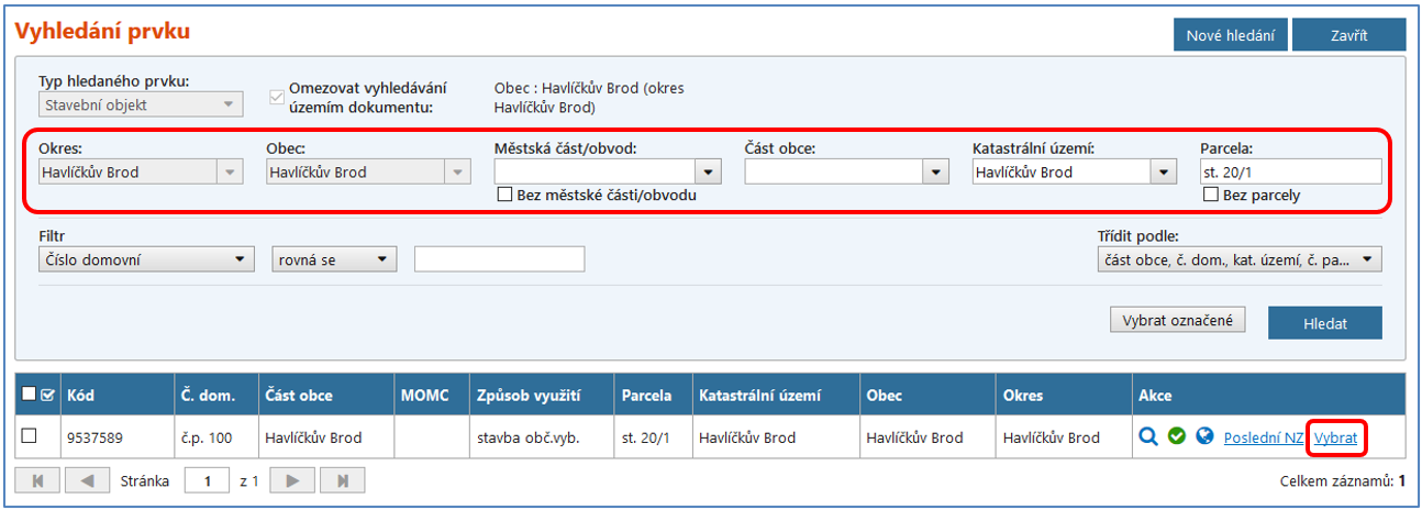 V bloku pod kritérii vyhledávání se po stisknutí tlačítka Hledat zobrazí všechny stavební objekty odpovídající zadaným kritériím. SO bez č.p./č.ev. je v našem případě pouze jeden. Pro další operaci se stavebním objektem ve sloupci Akce v řádku příslušného stavebního objektu klikněte na modrý podtržený odkaz Vybrat nebo na začátku řádku zaškrtněte vybraný stavební objekt a klikněte na tlačítko Vybrat označené.